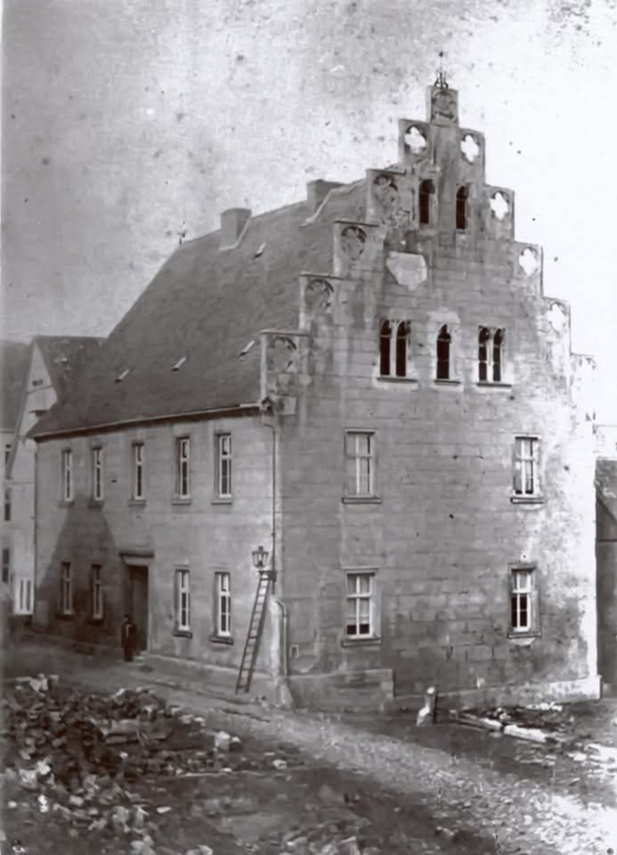 Das Rathaus in der Altstadt von Korbach in seiner 1706 geschaffenen Form nach dem großen Stechbahnbrand von 1885. Auf der linken Seite ist noch der Schattenwurf des unbeschädigt gebliebenen Hauses Nr. 8 (Gastwirtschaft Rauch, ab 1902 Herzog, heute Zabel) zu sehen. Das benachbarte Haus Nr. 10 ist dagegen vollständig niedergebrannt. Auf der Straße sind noch die Trümmer erkennbar.