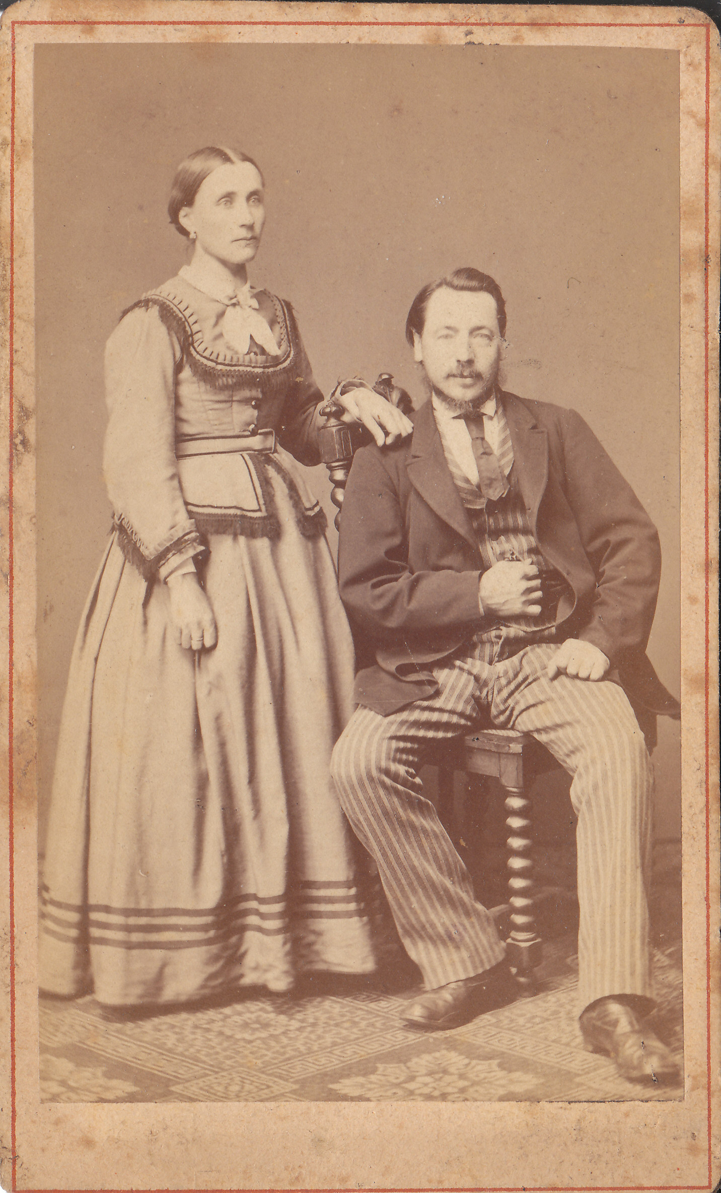 Das Foto zeigt Hutmacher und Kürschnermeister Friedrich Wilhelm Lückel (1833-1912) mit seiner Ehefrau Auguste Jäger (1839-1889). Da Friedrich und Auguste 1860 geheiratet haben und Auguste 1889 starb, ist die Entstehungszeit des Bildes dem Alter der Abgebildeten zufolge in die 1870er Jahre zu datieren. Auguste hatte zu diesem Zeitpunkt bereits sechs Töchter geboren. Privatarchiv. Hier klicken um das Bild in voller Auflösung herunterzuladen (1432 x 2368 Pixel, 1.7 MB).