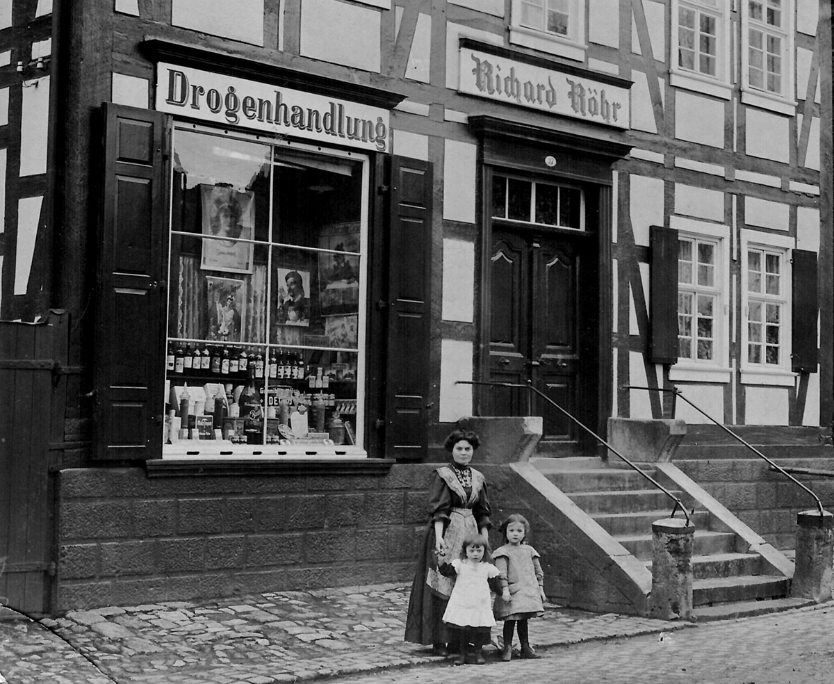 Anfang des 20. Jahrhunderts hieß die Drogerie Röhr noch "Drogenhandlung". Wie bei vielen Häusern in Korbach stand auch das Haus Nr. 8 auf einem mächtigen Steinsockel, so dass das Erdgeschoss etwas erhöht lag und über eine Außentreppe zu erreichen war. Bei den meisten Häusern wurde die Außentreppen in der zweiten Hälfte des 20. Jahrhunderts entweder nach Innen verlegt oder - wie hier - das Erdgeschoss auf Straßenniveau abgesenkt. Dies wiederum führte zu niedrigen Kellerdecken.
