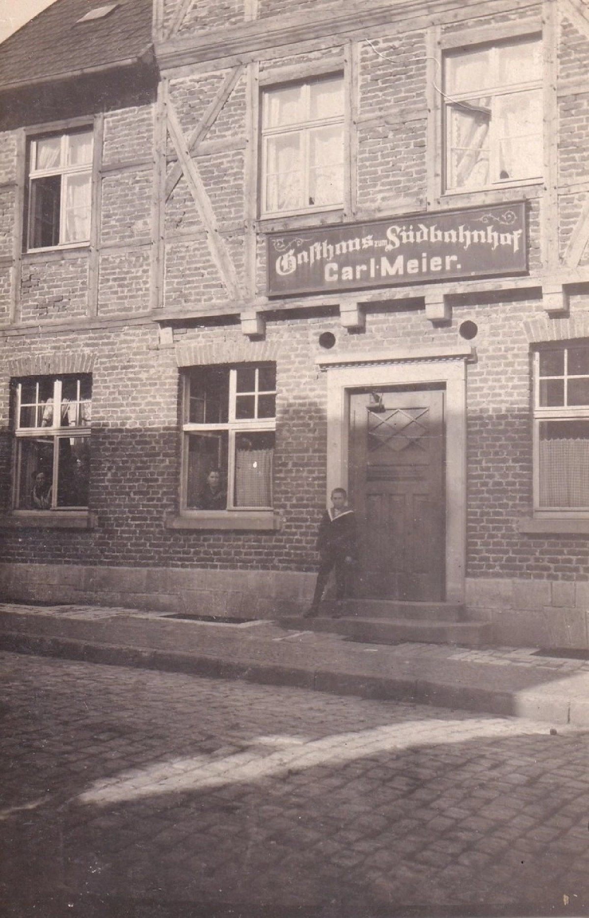 Dieses Foto soll 1918 aufgenommen worden sein und zeigt das 1913 errichtete Haus noch ohne Putz. Gut zu erkennen ist, dass es sich um einen Ziegelsteinbau handelt, der nur im Obergeschoss noch Fachwerkelemente besitzt. Anklicken für größere Version.