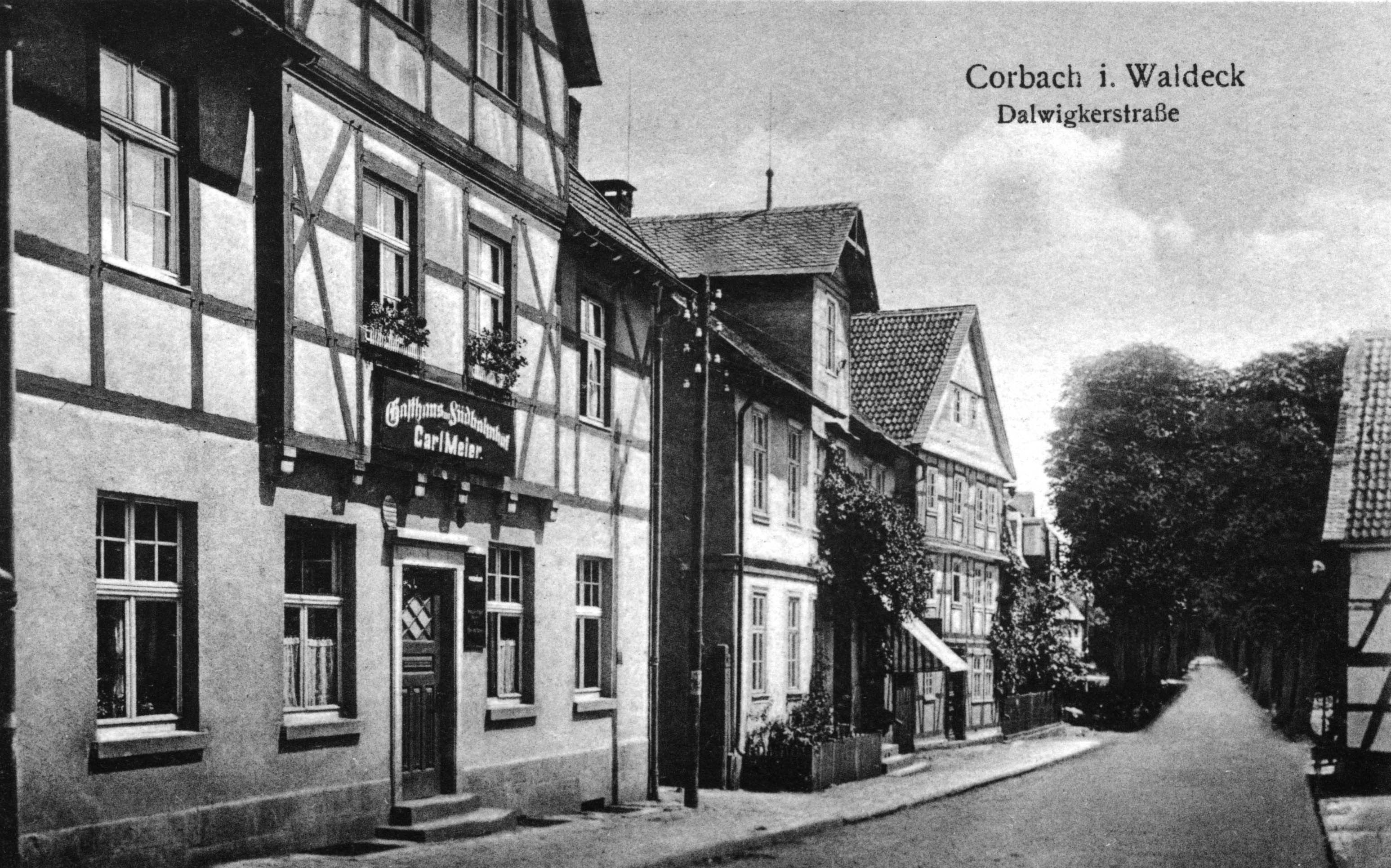 Das Lichtbild zeigt das alte, 1913 abgerissene Haus Nr. 9. Vor der Haus steht die Familie Carl Meier. Rechts davon das Haus Nr. 11. Daran anschließend das Haus Nr. 13, das in den 1970er Jahren als Verkehrshindernis entfernt wurde. Am Dalwigker Tor begann eine schöne Kastanienalle, die in die Wildunger Landstraße mündete. Anklicken für größere Version.