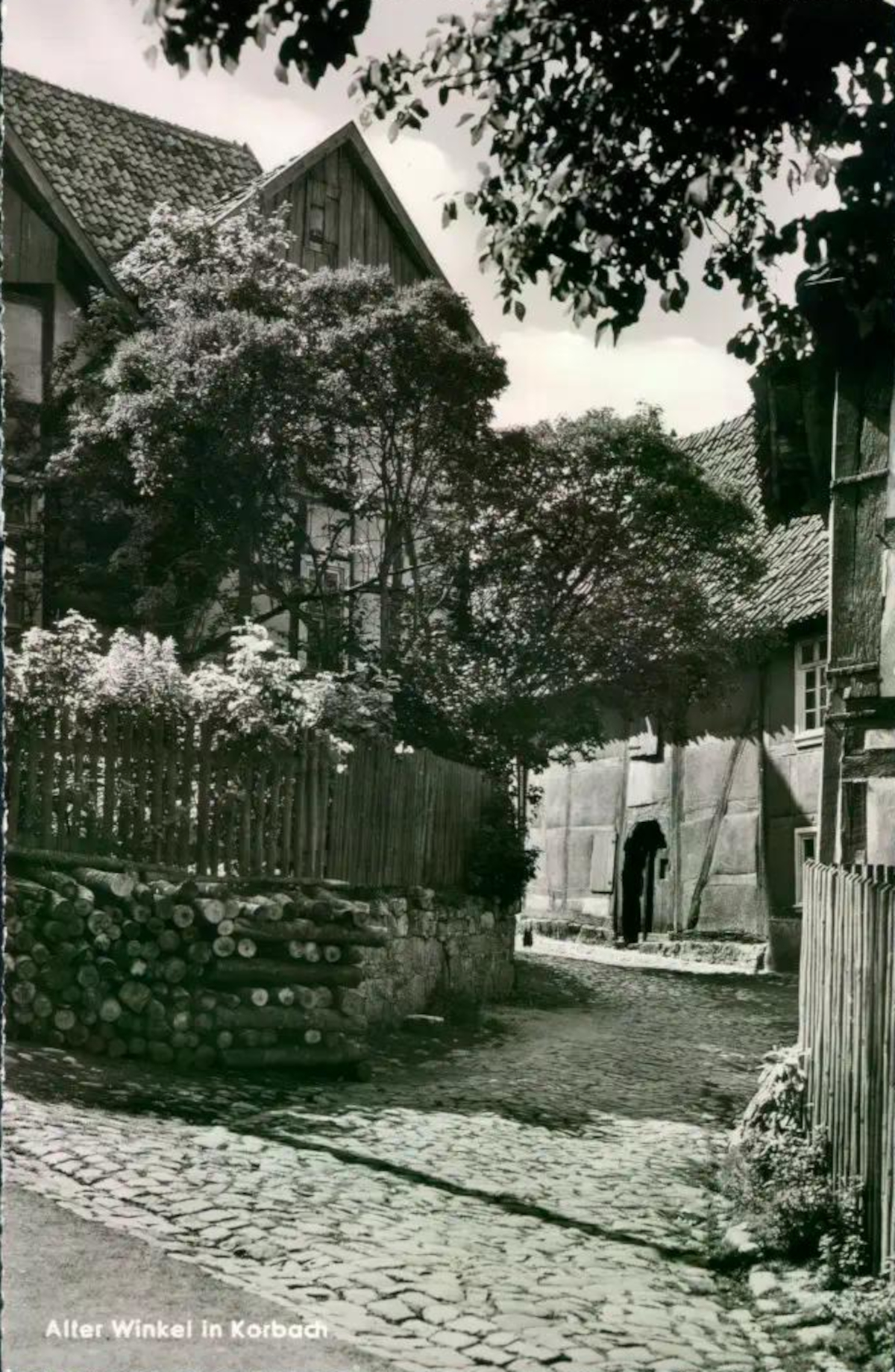 Das Haus Nr. 2 der Kilianstraße in der Altstadt von Korbach um 1940. Über der schönen alten Haustür ist die Inschrift, die auf den Erbauer hinweist, noch gut zu erkennen. Viele Jahre war sie durch ein Vordach verdeckt. Sie kam bei den Sanierungsarbeiten im Jahr 2019 wieder zum Vorschein, ist aber heute stark verwittert. Bildquelle: © Bildarchiv Foto Marburg