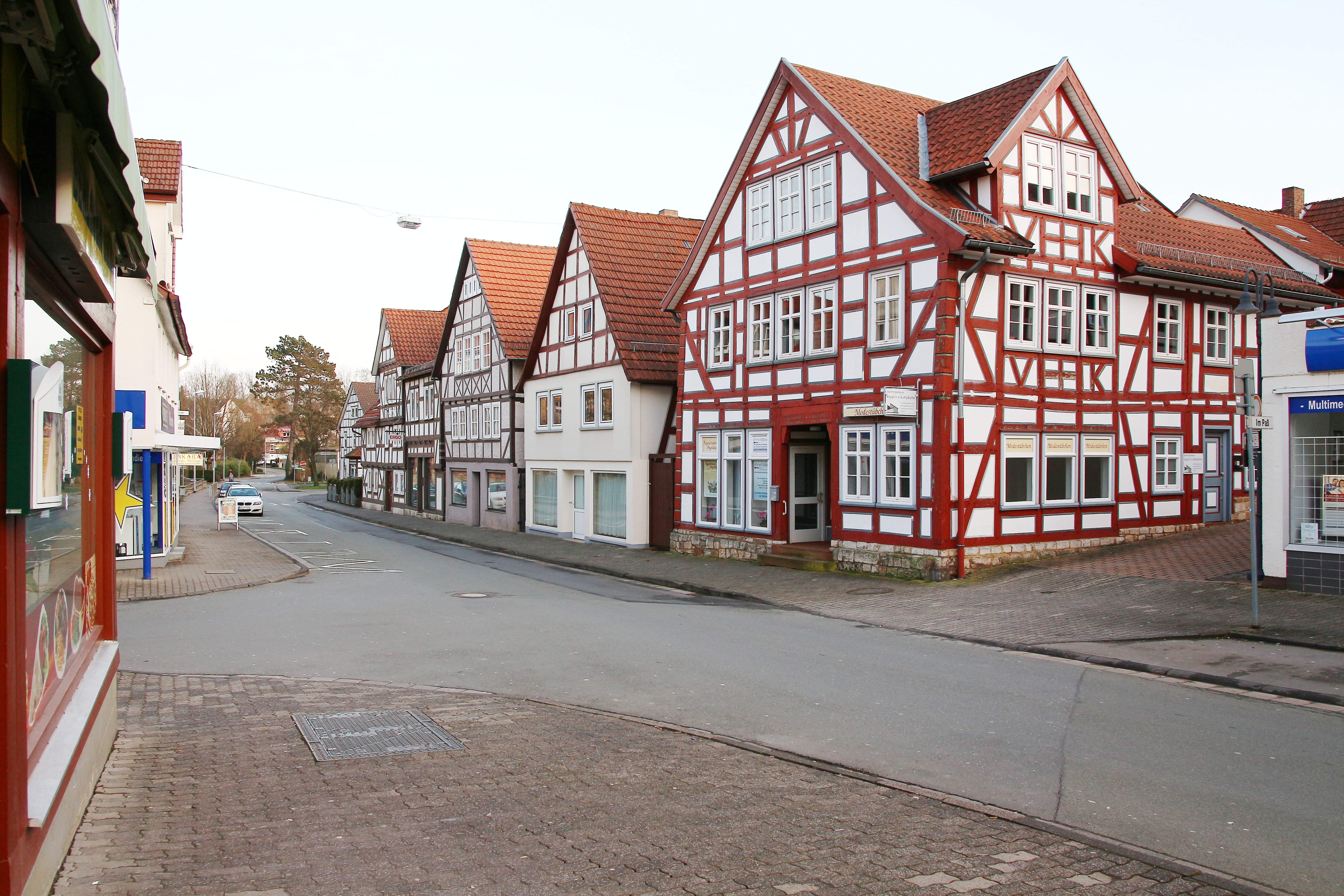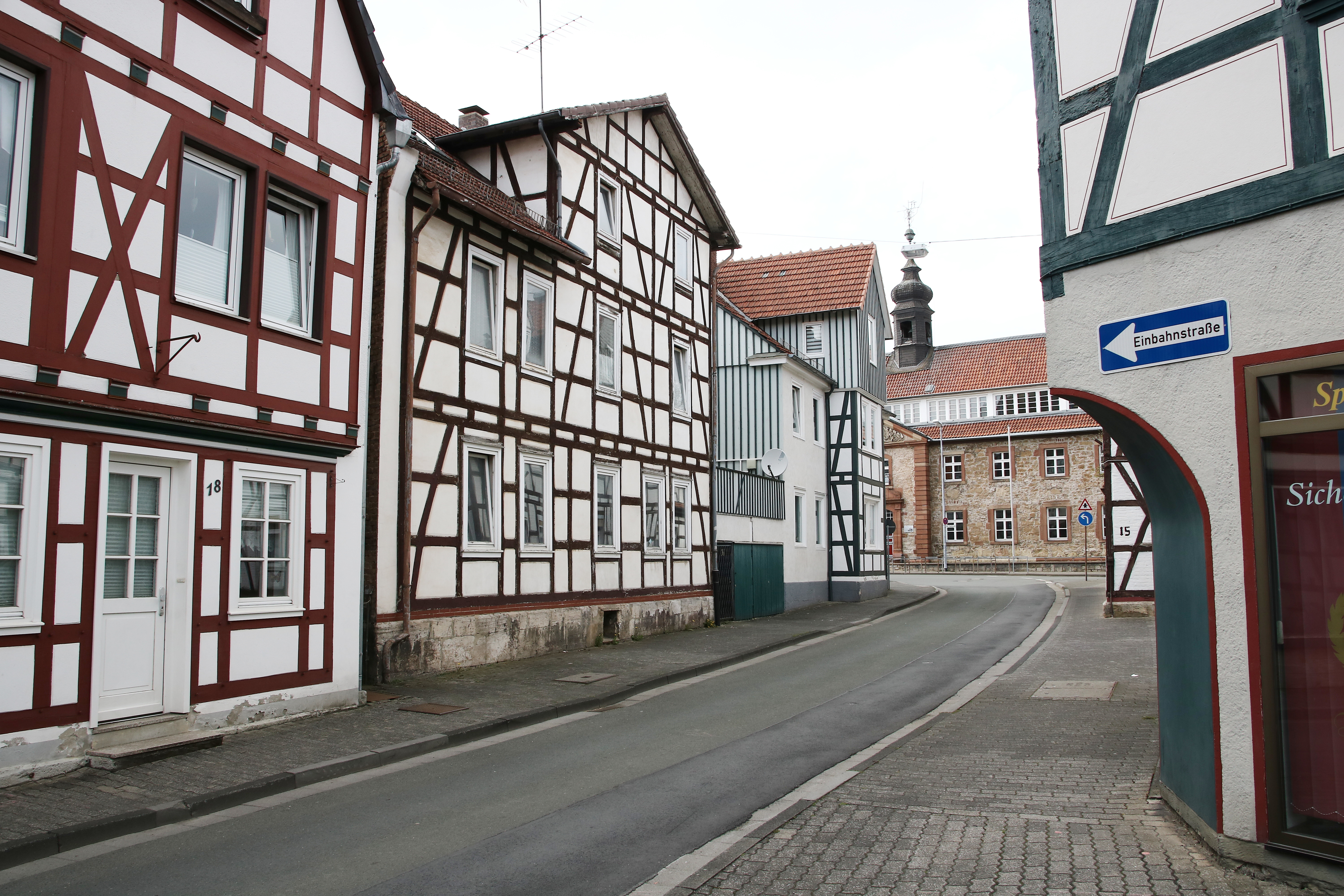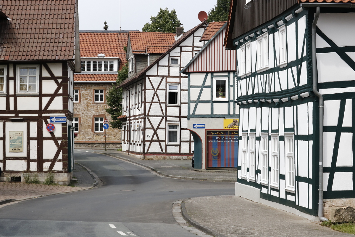 Die Klosterstraße in der Altstadt von Korbach ist benannt nach dem ehemaligen Franziskanerkloster. Hier die Häuser Nr. 6, 8, 10 und 12 (von rechts nach links). Aufnahmedatum: 24. Juli 2014. Anklicken für größere Version. Foto: Frank Löwenstein.
