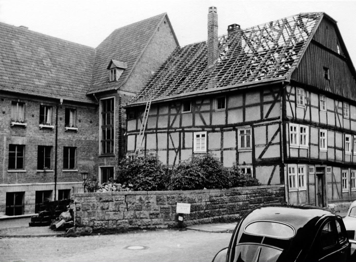 Um 1960 während des Abrisses des alten Fachwerkhauses. Der hintere Querflügel des neuen Verlagsgebäudes ist bereits errichtet.