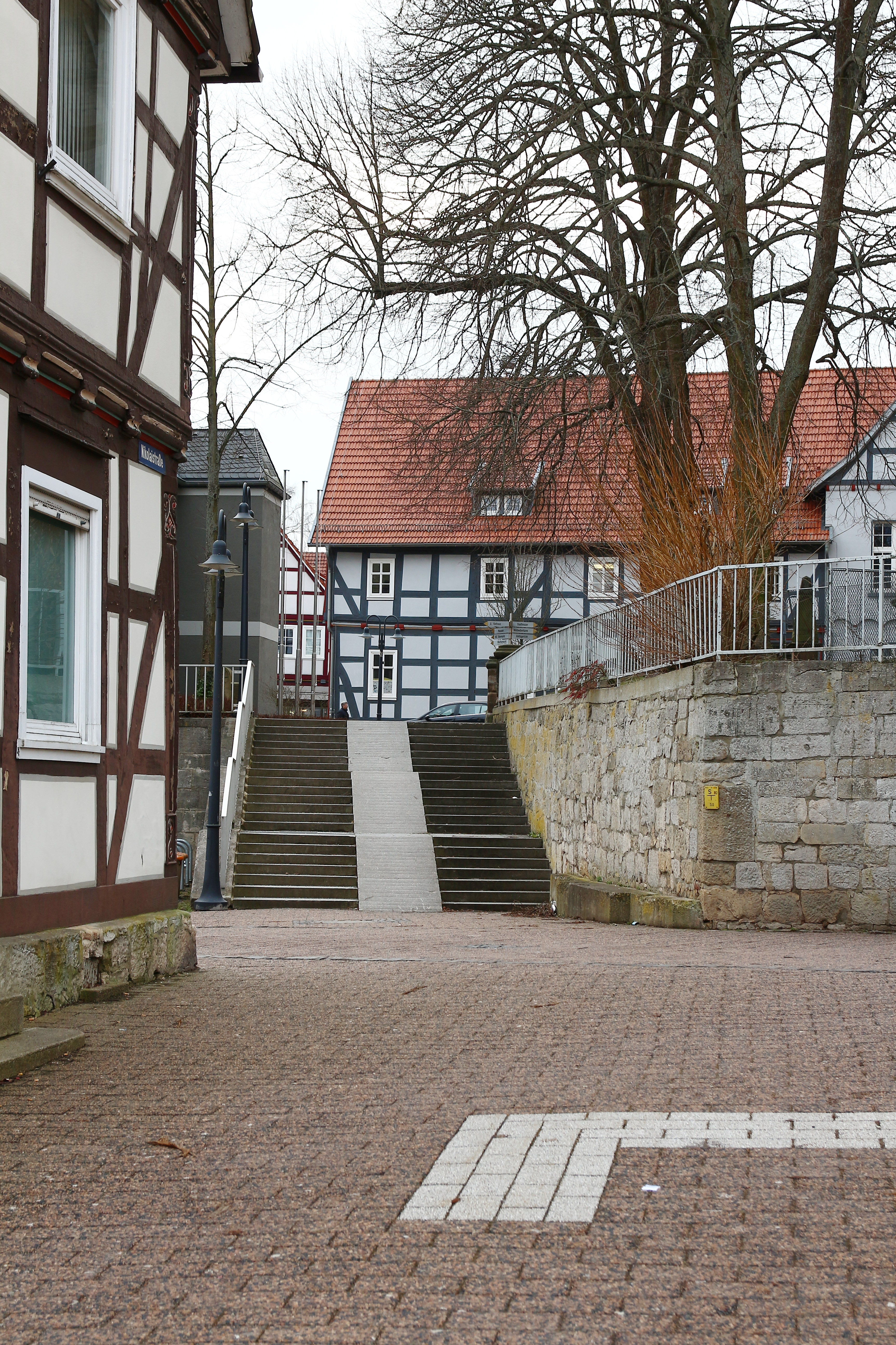 Die Nikolaistraße in der Altstadt von Korbach verbindet die Professor-Bier-Straße mit der Kirchstraße und kreuzt auf halbem Weg die Unterstraße. Links im Bild das Haus Nikolaistraße 1. Das graue Gebäude dahinter ist das Bürgerhaus (Kirchstraße 7). Das bläulich gestrichene Fachwerkhaus über der Treppenanlage ist das Gebäude Kirchstraße 20. Die Bruchsteinmauer rechts umschließt den Kirchhof der Nikolaikirche. Aufnahmedatum: 18. Februar 2016. Anklicken für größere Version. Foto: Frank Löwenstein.